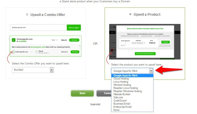 During the Domain Registration process, the SuperSite 2 displays a modal which upsells Linux Hosting by default. Through your SuperSite 2 Admin Area, you may select a different product to sell in the Upsell Modal.