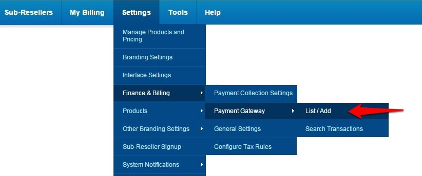 • Click on Setting > Finance & Billing > Payment Gateway > List/Add.