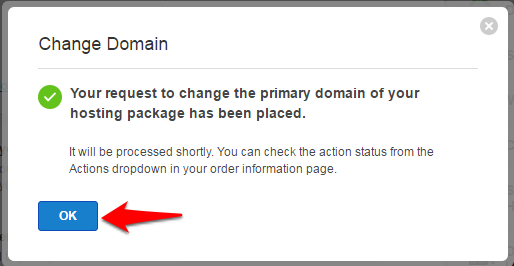 - The primary domain name of the hosting package cannot be modified if the new domain does not exist in your account. You will need to use a domain that you have registered in your account.