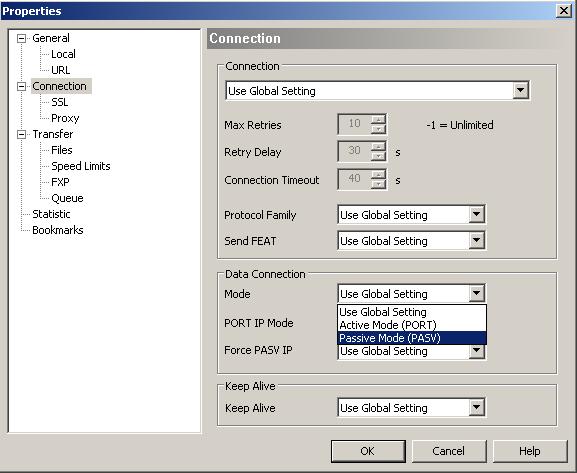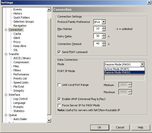 Under the Connection dialog, change the Mode in the Data Connection section from Passive Mode (PASV) to Active Mode (PORT) or vice versa. Click OK to save the changes.